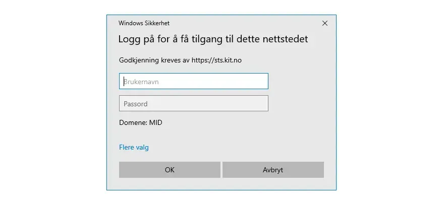 Det kan varierer litt fra nettleser til nettleser hvordan bildet ser ut i dette steget. Men du skal uansett skrive inn brukernavn og passord: