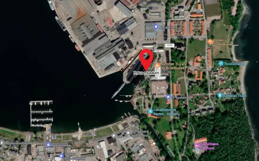 - Ta tog RE20 fra Oslo S til Moss, deretter Bastøferga over fjorden. Fra Horten fergekai kan du ta VKTs buss 01 til Bromsveien og gå fem minutter derfra, eller spasere hele veien fra fergekaia til Preus museum, ca 25 minutter.