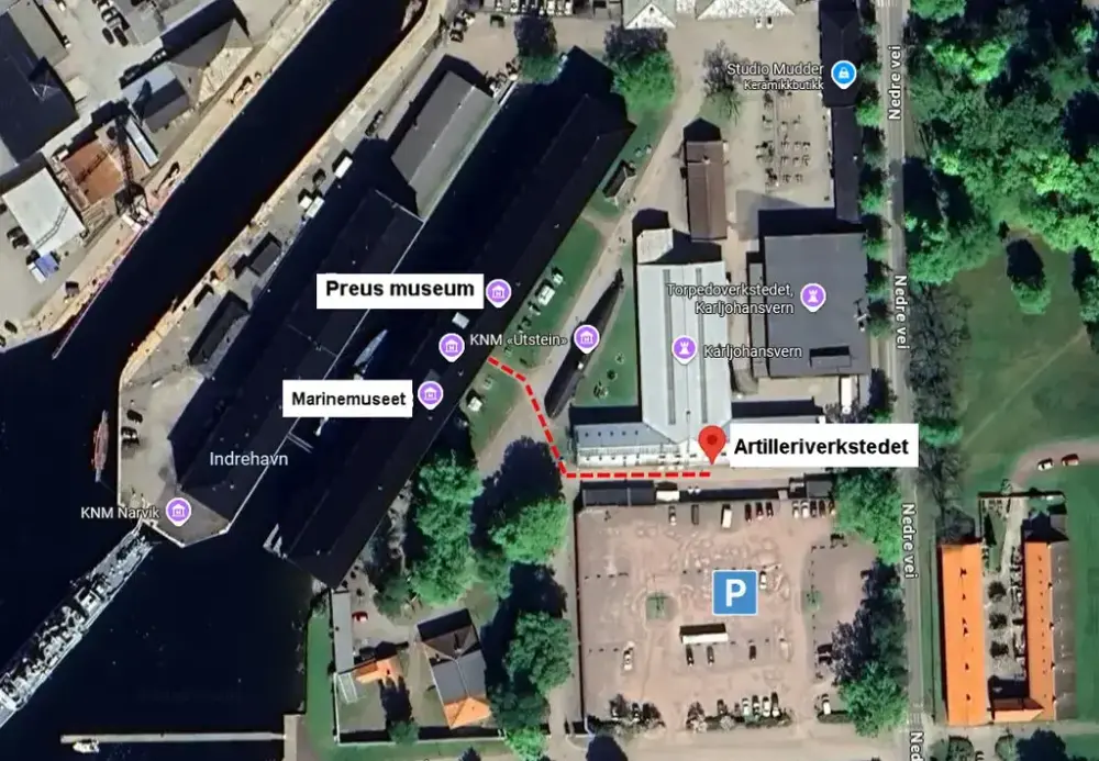 Deltakere kan parkere gratis på parkeringsplassen (merket på bildet over) foran Artilleriverkstedet. Denne plassen er reservert disse dagene. Her trenger man heller ikke registrere parkeringen i app.