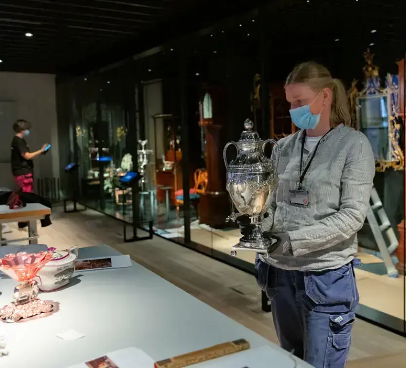 Montering av gjenstander i utstillingen TIDSROM 1600-1914. (Foto: Haakon Harriss/Norsk Folkemuseum)