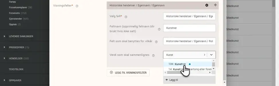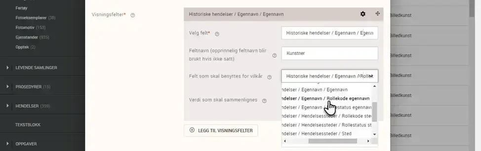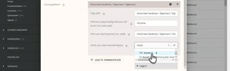 Et nytt felt dukker opp i det man har valgt kriterium. Dette feltet viser listeverdiene som finnes tilgjengelig under vilkårsfeltet. I eksempelet her velger vi «Kunstner» under vilkårsfeltet «Rollekode» for egennavn:
