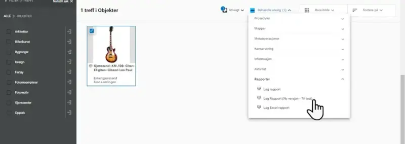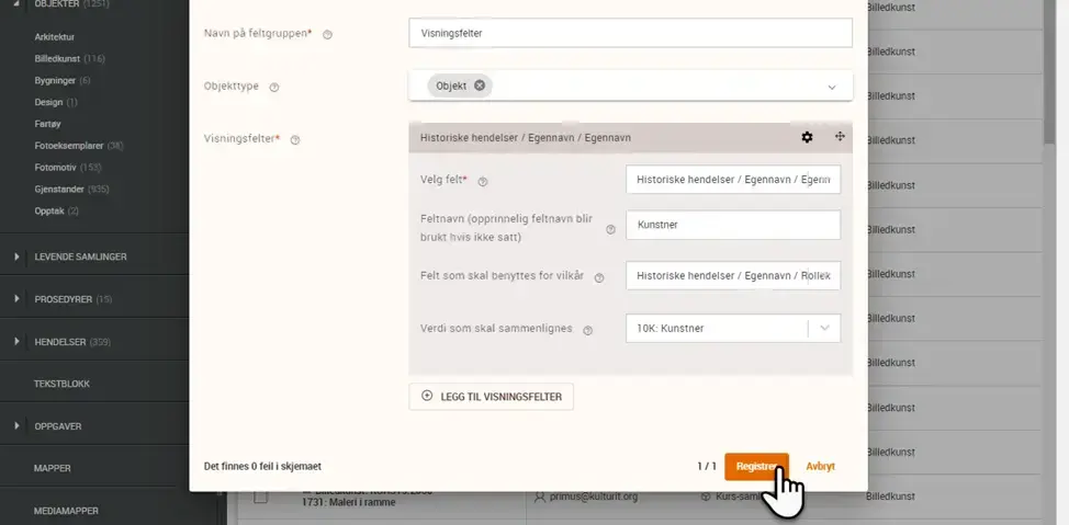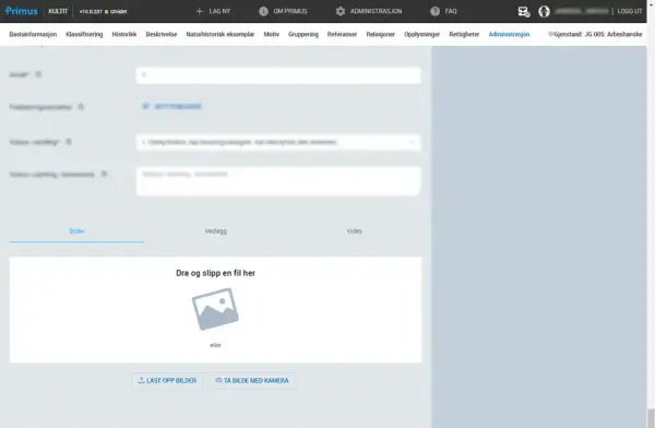 Bildeopplastning er flyttet ut av første del av registreringen. Når du skal laste inn et bilde i forbindelse med registrering, gjør du det i andre del, nederst på siden. Det er nå også støtte for å legge til video-, lyd (Opptaksobjekt) og vedleggfiler i forbindelse med registrering av nytt objekt.