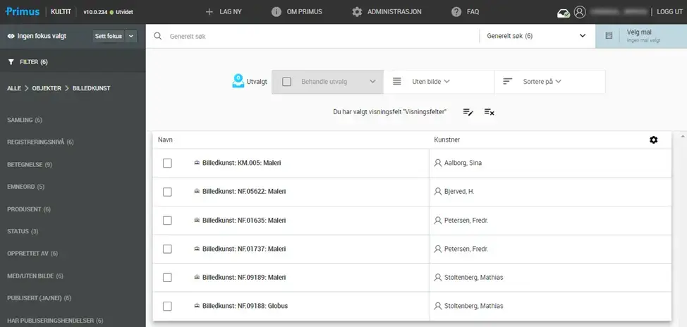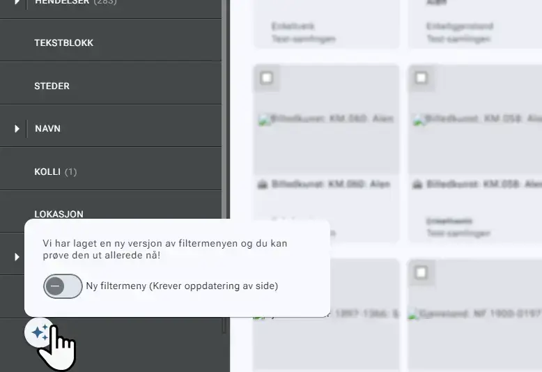 Vi arbeider med å redesigne filtermenyen i Primus 10. I siste versjon kan du prøve ut endringene vi har gjort. Det gjør du ved å klikke på ikonet nederst til venstre i skjermbildet på søkesiden.