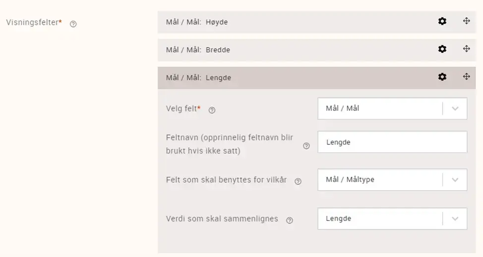 Når du redigerer visningsfelter finnes det en ny valgmulighet for å presisere hva slags informasjon som skal vises i feltet som legges til. Dette gjøres ved å sette et vilkår/kriterium for visning. Eksempel: