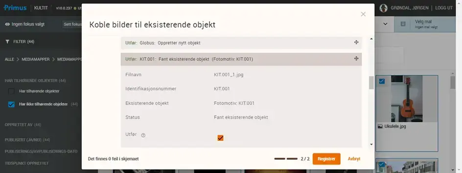 Det er nå mulig å matche et filnavn med et eksisterende objekt i databasen i forbindelse med masseopplasting av bilder. I Primus Win har dette vært kjent som identifikasjonsnummerkoding. Dette kan være nyttig hvis du skal arbeide med bildeinnlegging mot et stort antall objekter. Om det ikke finnes noe eksisterende objekt i databasen, er det mulig å markere for at et nytt objekt med matchende identifikasjonsnummer skal opprettes.