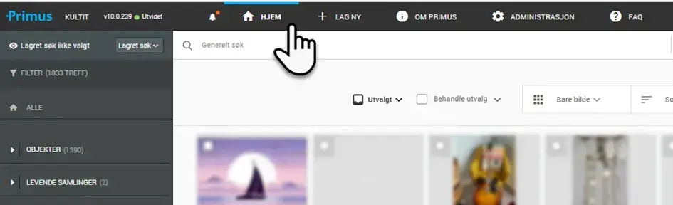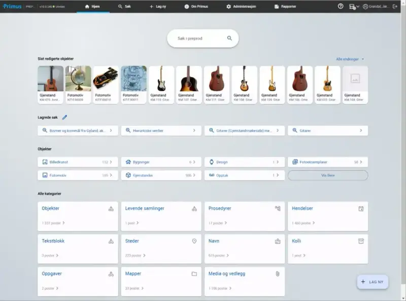 Her ser du de sist redigerte objektene i databasen, og du har hurtigtilgang til lagrede søk. I tillegg har du snarveier til ulike søkesider. Disse kan du bruke til å navigere til kategorien du vil søke i, fra Hjem-siden.