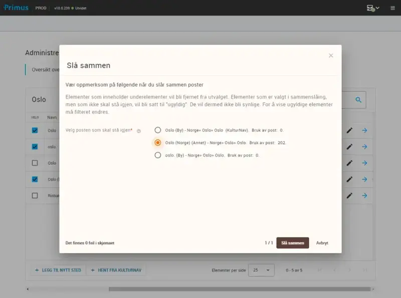 Det er nå mulig å slå sammen stedsposter i Primus 10. Ved sammenslåing ugyldiggjøres stedsposter som ikke skal videreføres. Alle koblinger knyttet til stedsposter som ugyldiggjøres, overføres til stedsposten som skal stå igjen etter sammenslåingen.