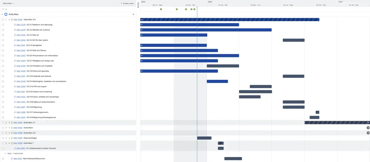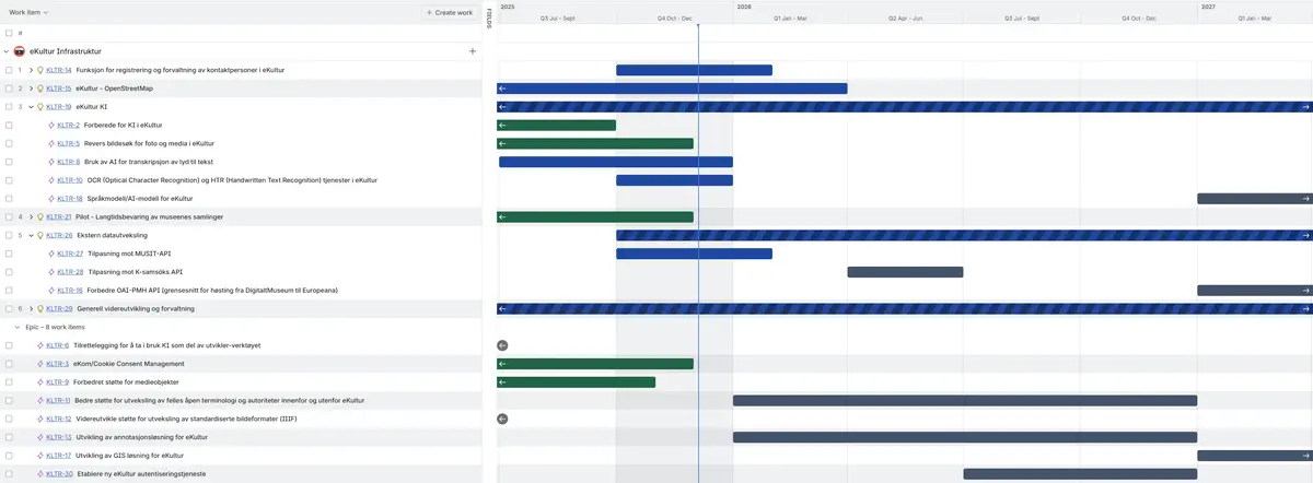 Blå og blå/mørkeblå skravert tidslinje: indikerer at arbeidet pågår.